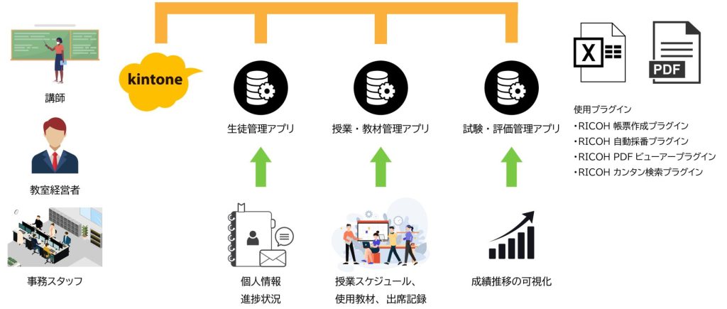 - 生徒情報や授業内容、試験結果をクラウド上で一元管理できるほか、RICOHの専用プラグインにより、帳票出力・PDF管理・検索性を大幅に強化